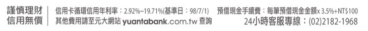 - 本活動旅遊類交易係由本行一次墊付消費款予特約商店,並由持卡人一次或分期繳付消費帳款予本行。本行與特約商店並無任何合夥、經銷、代理或保證關係,若持卡人與特約商店就所購買之商品/服務之品質、數量、金額有所爭議時,應向特約商店尋求解決,不得因此拒付信用卡款項。