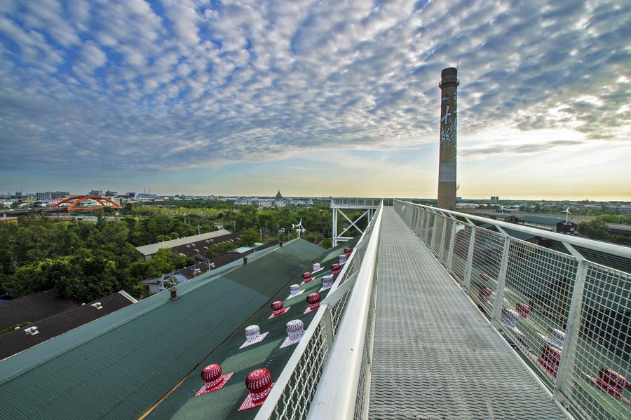大魚的魚腹是平滑的白色曲線,進入魚肚走上二樓,藍色三角網起的魚背籠罩眾人,向外延伸自尾鰭輕輕揚起,口中央以448片彩色釉燒玻璃拼湊出台灣島嶼,象徵愛與包容的台灣,接納不同時代的來客。