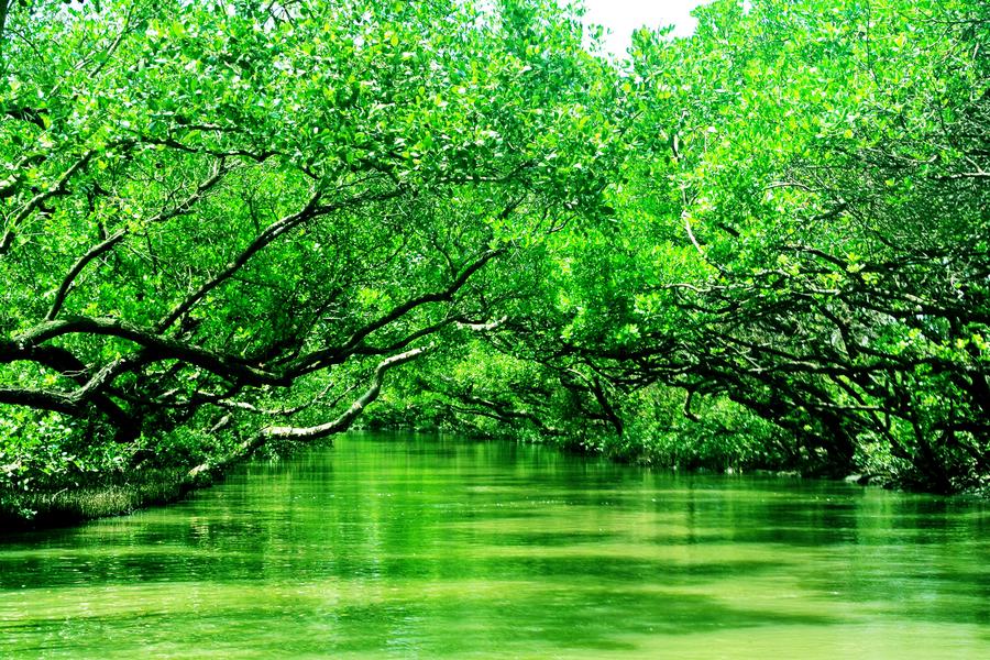 兩旁的紅樹林向中央生長齊聚,交織出茂密的半圓綠頂,一層一層的向前方疊出深邃的廊道,不知盡頭而顯得神秘,四草綠隧也因此有了小亞馬遜之稱。國內外遊客紛至沓來,長長的等候為得是乘上通往這座仙境的管筏,隨著波紋緩緩前行,微風掠過輕撫臉頰,承載陽光溫暖的重量,穿梭在這座城市秘境裡。