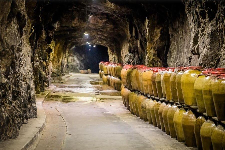 酒香百里的八八坑道打開了八八坑道的大門,就像是開啟了一段窖藏的祕辛,坑道口兩旁擺著滿滿酒甕、上方有著大大的「八八坑道」四個字,走進坑道,內部可是相當涼爽,長年維持在攝氏16-19度,恆溫又穩定的環境,讓存放的老酒有一定品質,是絕佳的儲藏酒窖,坑道主體由花崗岩所構成,而坑道所在,就位於馬祖酒廠斜前方不遠處