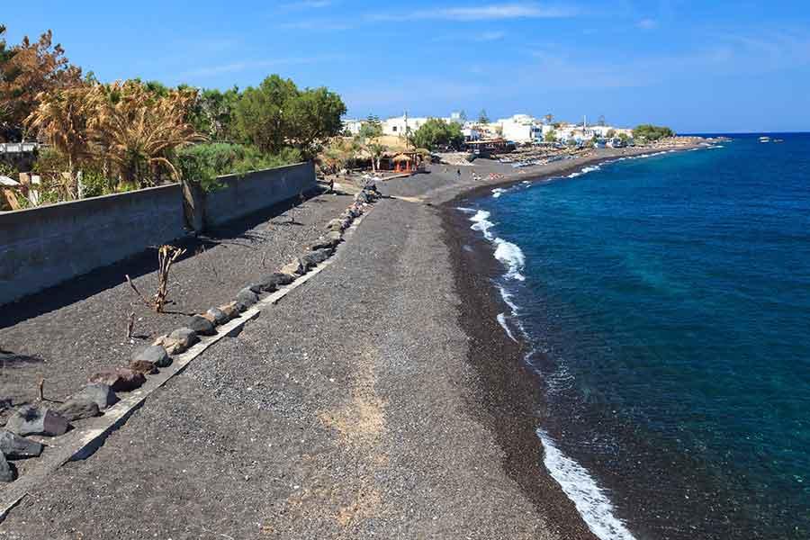 黑沙灘是火山島噴發過後的火山灰沈積下黑砂石不斷風化後形成的綿長海岸線,也是聖托里尼島東面最受歡迎的度假海灘。在旅遊旺季沙灘上人會非常多,海水在黑色的沙灘的映襯之下,顯得更加清澈和湛藍