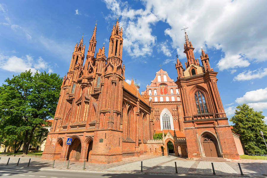 聖安娜教堂 維爾紐斯 維爾紐斯舊城中的羅馬天主教堂,教堂融合了華麗的哥德式建築和磚式哥特建築的風格,由33種不同形狀的紅色磚塊建造而成,具有地標性的價值。被譽為哥德式建築藝術中的明珠。拿破侖東征時路過此地,被聖安妮教堂的精美所吸引,曾想將它「放在手掌中帶回巴黎」。
