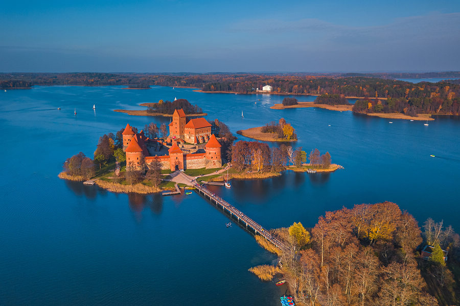 特拉凱城堡 維爾紐斯 立陶宛的古都,現被劃定為國家歷史文物園區。親王維多夫達於15世紀建的特拉凱水中古堡,古堡位於加爾瓦湖心島,是東歐地區唯一的一座水上城堡。橙紅色如童話故事般古堡矗立在清澈的湖水中,如夢似幻,是立陶宛著名的風景渡假區。