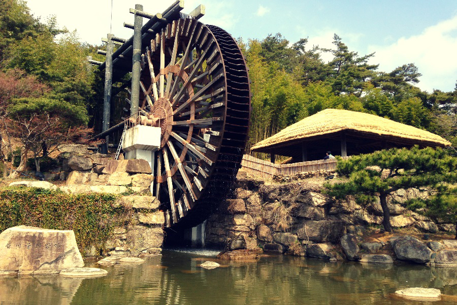 普門觀光園區 慶州 以普門湖爲中心,佔地面積約1033公頃(總面積323萬坪),全境被指定爲溫泉區及觀光特區,是一處綜合性的觀光療養地,入口處有一個巨大的水車,德洞湖水沿渠而下,使水車在自然動力下轉動。入口處還有一個高達12米的人工瀑布。